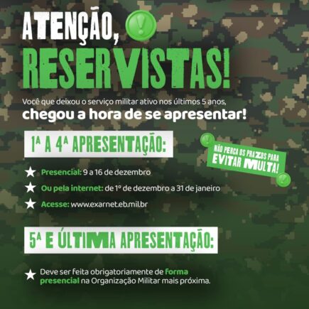 O Exército Brasileiro inicia, a partir de 1º de dezembro, o período de apresentação obrigatória para reservistas que deixaram o serviço ativo nos últimos cinco anos. A apresentação, prevista na Lei do Serviço Militar, deve ser realizada entre a 1ª e a 4ª etapas de forma presencial — de 9 a 16 de dezembro — …