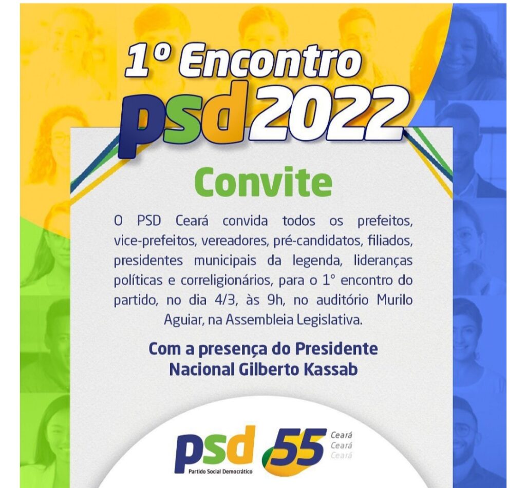 O presidente nacional do PSD, Gilberto Kassab, desembarca no Ceará para um evento estadual do PSD, sigla liderada, no Ceará, pelo ex-vice-governador Domingos Filho, nesta sexta-feira (04), a partir das 9h da manhã na Assembleia Legislativa. O encontro também marcará a filiação de novos quadros da sigla no Estado.