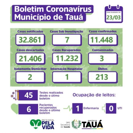 Secretaria de Saúde divulgou mais um Boletim Epidemeologico na noite de ontem (23), os numeros contabilizam mais um óbito por Covid. Tauá acumula 213 pessoas que morreram desde o inicio da pandemia. Só em 2022, foram registradas 24 mortes. Atualmente 7 casos estão sob investigação. Raimundinho Vitor