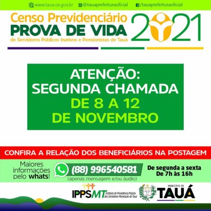 O Instituto de Previdência Própria dos Servidores Municipais de Tauá – IPPSMT anunciou hoje(08) que realizará uma segunda chamada para os aposentados e pensionistas, do Censo Previdenciário – Prova de Vida. Os beneficiários deverão comparecer na sede do IPPSMT, na Av. Odilon Aguiar, Nº 287, centro, horário de 7h ás 13h, até sexta-feira, 12 de novembro. Também foi disponibilizado …