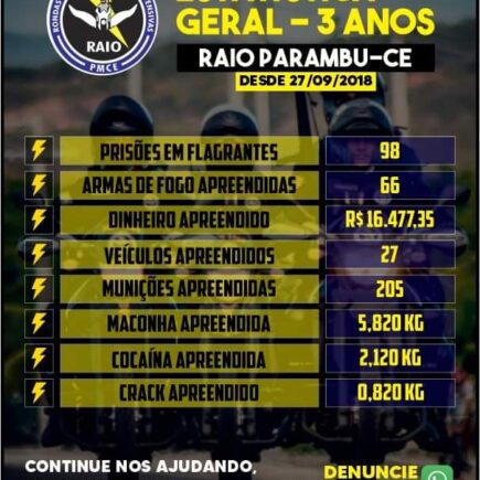 A unidade do CPRAIO do município de Parambu completa 3 anos de inauguração nesta segunda-feira(27). O Comandante da 3ª Companhia do 5º BPRAIO, Tenente Wladimir Rocha encaminhou ao Blog do Wlrismar, a estatística geral contendo um balanço do trabalho realizado nesse período. O combate a tráfico de drogas é uma das principais ações dos raianos …