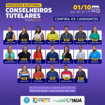 A comissão eleitoral do Conselho Municipal dos Direitos da Criança e do Adolescente, responsável pelo processo de escolha dos novos Conselheiros Tutelares do Município de Tauá, com o acompanhamento do Ministério Público, divulgou na manhã de hoje (26), os números dos candidatos que disputarão o voto da população. A eleição direta acontecerá no dia 1º de …